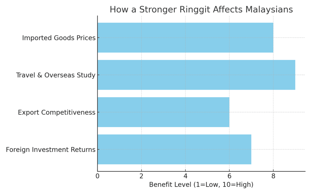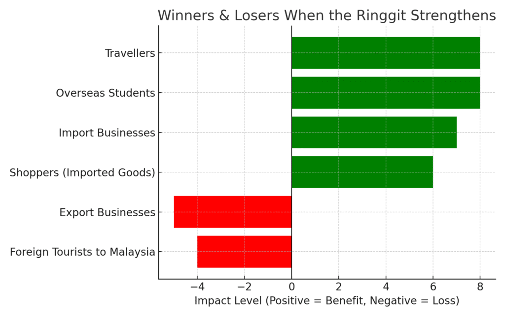 | Import Businesses | Overseas purchases (raw materials, machinery) cost less in MYR terms. |